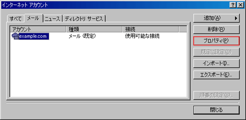 設定を変更するメールアカウントを選択して、「プロパティ」ボタンをクリックします。